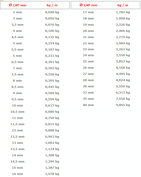 Çap mmKg m  Çap mmKg mÇap mm  Kg mÇap mmKg m